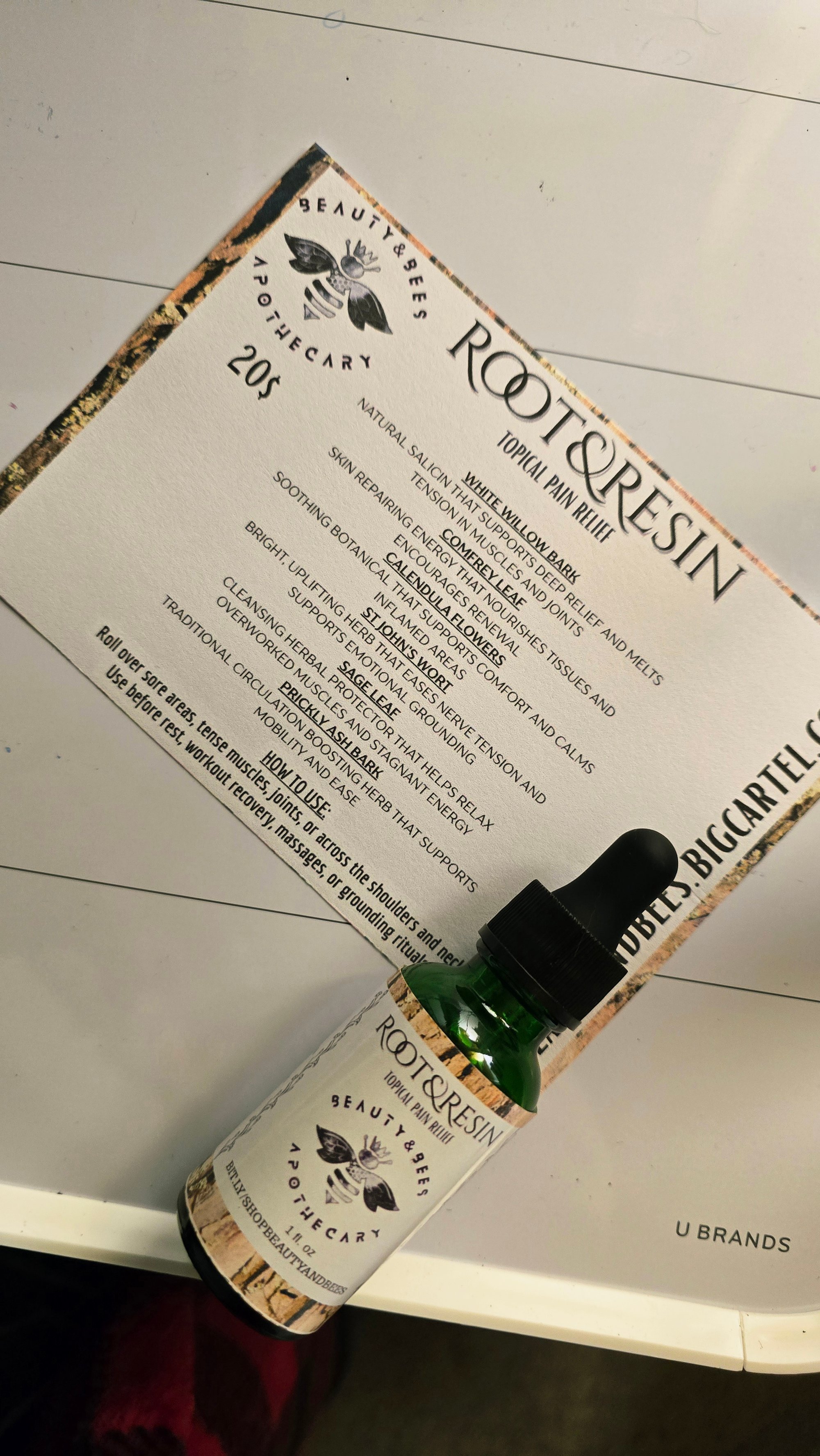 Root and Resin Relief Oil is a powerful herbal infused pain supporting oil crafted to ease sore muscles, joint discomfort, nerve tension, and everyday body aches. This small batch formula combines six healing herbs and two rich carrier oils to create a deep penetrating comfort blend that absorbs beautifully and brings instant grounding.
